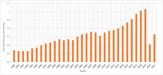 CO2 emissions of the aviation sector, in billion tons, per decade (Source: Our World in Data (2024) https://ourworldindata.org/global-aviation-emissions, accessed on 14 March 2025).