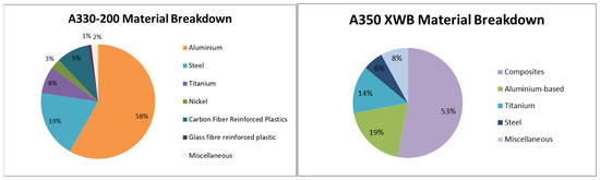 Aircraft decommissioning involves the systematic dismantling, segregation, and recycling of materials to maximize resource recovery while minimizing environmental impact. The metallic and polymeric components of aircraft represent over 85% of total structural mass, offering significant potential for circular material flows. Comparative data from Airbus A330-200 and A350 XWB models (Figure 4) illustrate the evolution toward lightweight alloys and composite materials. The A330’s metallic structure accounts for approximately 68% aluminum, 11% titanium, and 7% steel, whereas the A350 integrates 53% composites, 19% aluminum–lithium alloys, 14% titanium, and 7% steel. These transitions reduce operational weight and emissions but complicate EoL material recovery due to the heterogeneous composition of composites. Aluminum, commonly found in fuselage, wings, and engine turbines, is extensively recycled into aircraft parts, automotive, and construction materials. Steel and titanium, primarily used in landing gear and engine components, are repurposed in heavy industries and high-performance manufacturing. Tungsten and copper are often reused in electronic and industrial applications. Although plastic interior parts and insulation materials have some potential for repurposing, safety equipment and tires present more recycling challenges, although aircraft tires can be retreated up to 12 times. While materials such as aluminum, steel, and titanium have well-established recycling pathways, plastics, insulation, and safety equipment face difficulties due to their material composition and regulatory constraints (see Table 4 for more details).
