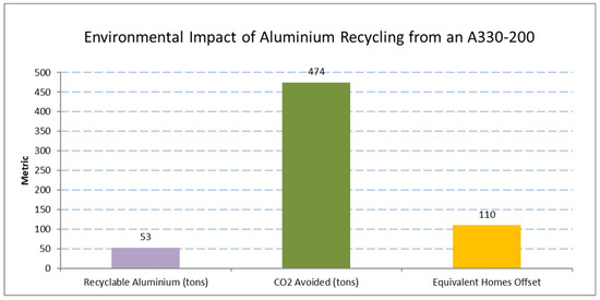 To contextualize this environmental benefit, this reduction is equivalent to the annual emissions of 110 residential homes, provided only by one aircraft (the average CO2 emissions per US household is 4.4 tons annually [43]). These gains are depicted in Figure 5. This demonstrates the critical role that CE practices in aviation can play in significantly reducing the sector’s carbon footprint, aligning with global sustainability targets, and reinforcing the necessity of advancing aircraft recycling technologies and policies.