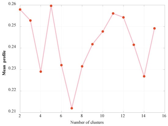As shown in Figure 4, when the number of clusters increases from 2 to 15, the mean profile value fluctuates between 0.260 and 0.213. The highest mean profile value of 0.260 occurs at 5 clusters, while the lowest value of 0.213 is observed at 7 clusters. For individual scenarios, a higher profile value indicates stronger tightness within its cluster and greater separation from other clusters, thus the clustering performance is better. Accordingly, a clustering number of 5 is chosen in this study, which means dividing all historical scenarios into 5 clusters has optimal clustering performance. Figure 5 shows the generated typical and extreme scenarios of wind speed and solar radiation when the clustering number is set to 5.