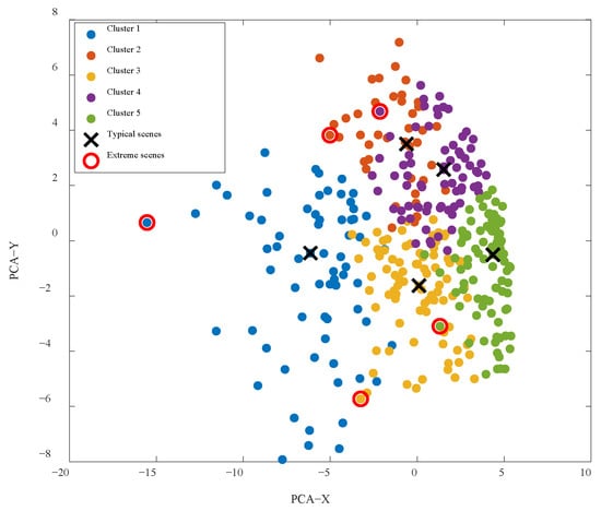 As shown in Figure 5, scenarios within each cluster exhibit strong tightness, indicating effective clustering. Clear separation between clusters demonstrates high dissimilarity, reflecting superior clustering performance. For typical scenarios, five clusters collectively selected five representative scenario points. Each representative point corresponds to an actual scenario and is positioned near the cluster center. For extreme scenarios, this paper selected five extreme scenario points, one from each cluster. Compared to all corresponding points within each cluster, the extreme scenario points in each cluster are the farthest from the typical scenario points, thus exhibiting the greatest intra-cluster divergence. Furthermore, the extreme scenario points within each cluster are significantly distant from one another, indicating pronounced divergence. This demonstrates that the selected extreme scenarios possess the maximum incremental information.