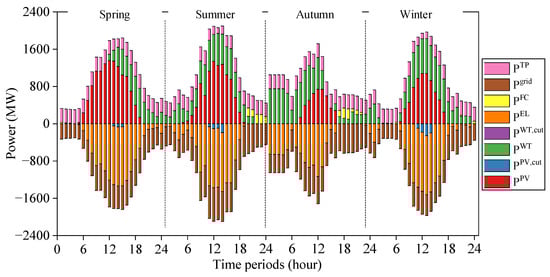 The REB involving seasonal hydrogen storage primarily comprises four pieces of equipment: thermal power generation unit (TP), wind turbines (WTs), PV, and HES. HES contains three types of equipment: EL, HFC, and HST. The overall structure of REBs is illustrated in Figure 1.