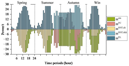 As a flexible resource, energy storage provides an effective means to counteract fluctuations of the new energy and enhance its integration level. With the advancement of various energy storage technologies, hydrogen energy storage (HES) technology containing electrolyzer (EL), hydrogen storage tank (HST), and hydrogen fuel cell (HFC) has garnered widespread attention [,]. Hydrogen energy possesses high energy density, extended storage duration, and environmental friendliness, which enables HES be able to achieve efficient storage and release of electrical energy through bidirectional electricity-hydrogen conversion []. Leveraging these advantages, HES has been introduced into renewable energy systems to enhance the consumption of renewable energy [,,]. Zhuo L et al. [] introduced HES into an integrated energy system and further designed a capacity configuration optimization model, aiming to minimize total system costs and maximize the utilization rate of HES. Wang Y et al. [] deployed HES to replace fossil fuels in the energy system and constructed a dual-layer optimization allocation model for system capacity. This approach increased the system’s energy storage benefits while reducing operational carbon emissions. Habibifar R et al. [] integrated HES with batteries to form a hybrid energy storage system and then designed a stochastic optimization model to determine the system’s optimal capacity. The research showed that the introduction of HES played a crucial role in enhancing grid flexibility and economic viability. Wu D et al. [] proposed integrating HES into multi-regional integrated energy systems in urban areas and then designed an optimized configuration strategy with profit maximization. The existing approach of integrating HES into a renewable energy system has some reference value for this paper. However, a large number of studies have not focused on its advantages in transferring electricity over seasonal and long-term time scales.
