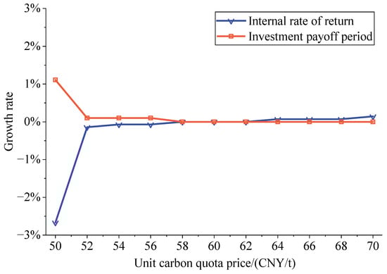 As shown in Figure 9, when the unit carbon quota price varies between 50 and 70 CNY/t, the payback period growth rate of DG-REBs ranges between 0.11% and 0%. As the unit carbon quota price increases, the payback period growth rate gradually decreases and stabilizes once the price exceeds 52. Additionally, the internal rate of return for DG-REBs ranges between −2.67% and 0.14%. As the unit carbon quota price increases, the internal rate of return growth rate gradually expands. Beyond a price of 52 CNY/t, the growth rate stabilizes and approaches 0%. Beyond a price of 62, the growth rate remains positive. This indicates that as the unit carbon quota price gradually increases within the 50–70 range, the DG-REB’s carbon revenue grows, the payback period slightly decreases, and the internal rate of return slightly increases. This occurs because the revenue generated by the DG-REB’s participation in the carbon market constitutes a very small proportion of its total revenue. Consequently, changes in the unit carbon quota price have a relatively low impact on the overall economic sensitivity of DG-REBs.