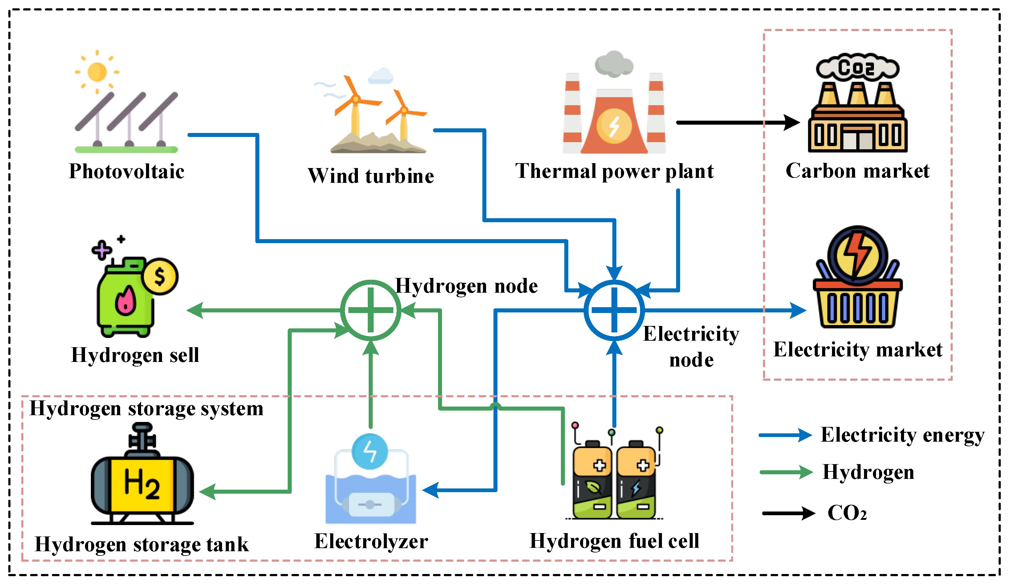 On the one hand, the DG-REB maintains connections with the utility grid, ensuring it can participate in electricity market transactions and enabling the cross-provincial transmission of traded electricity via the grid. On the other hand, the DG-REB can participate in carbon market transactions and generate revenue by controlling carbon emissions from TP. Furthermore, while ensuring a reliable electricity supply, DG-REBs can sell surplus hydrogen generated by EL in the hydrogen market to increase its own revenue.