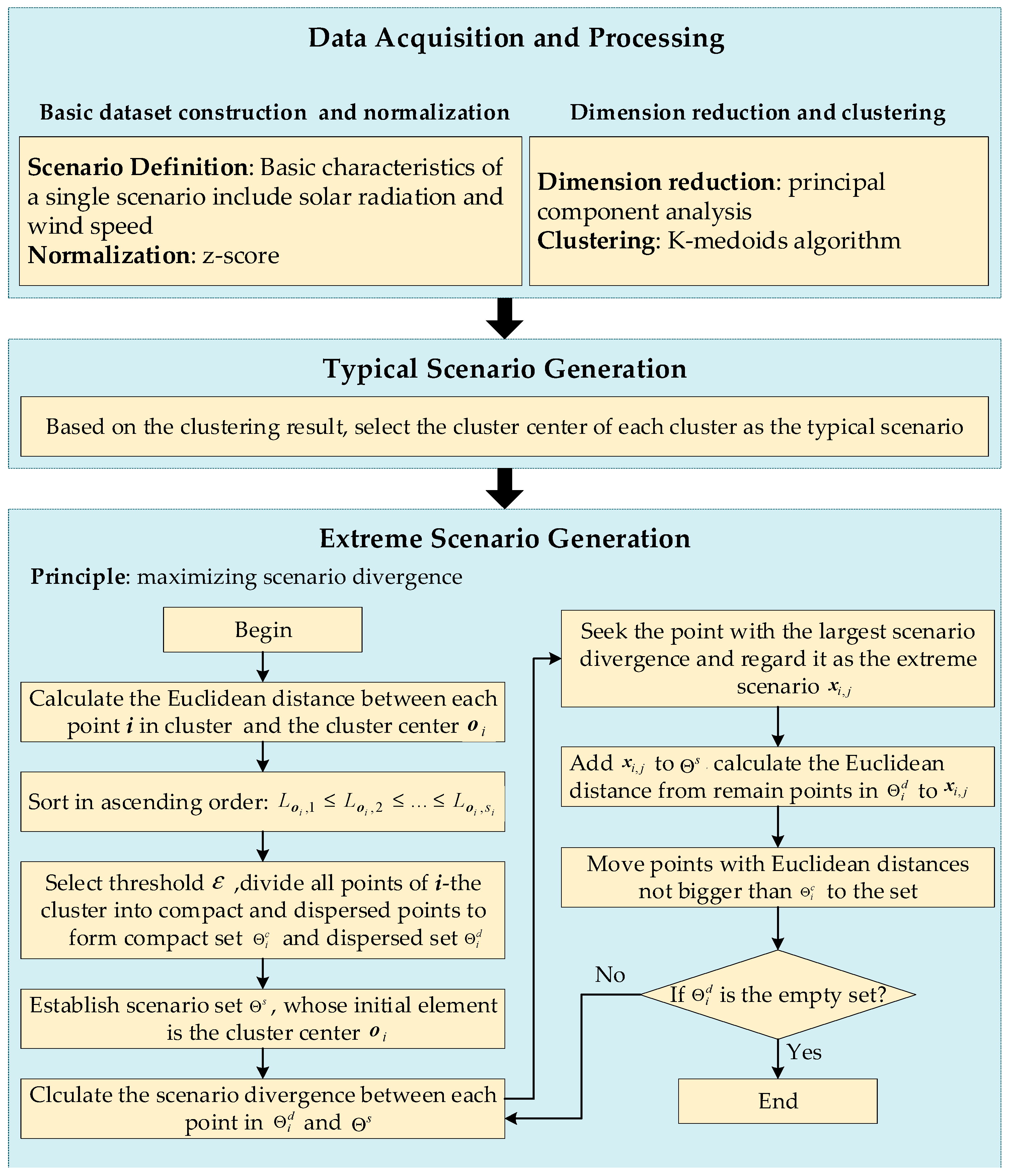 If introducing HES into REBs in desert and gobi regions (which are called DG-REBs), leveraging its seasonal storage advantage, the fluctuating and seasonally uneven characteristics of renewable energy within DG-REBs can be mitigated. Obviously, this offers an emerging approach to addressing existing challenges of REBs. Therefore, this paper proposes introducing HES into DG-REBs and further studies on the capacity configuration of the DG-REB. Capacity configuration studies often require modeling a large number of scenarios, which can lead to an exponential increase in decision variables and constraints within the model, resulting in difficulty or slow speed in model solution [25]. Selecting a small number of representative scenarios to replace a vast number of operational scenarios is an effective method to address the above issues [26]. Geng N et al. [27] applied the k-means method to conduct clustering analysis of typical scenarios of an island power supply system. Zhe T et al. [28] solved the operating optimization model of building a renewable energy system on the basis of generating load scenarios using the K-medoids method. Meanwhile, due to the frequent occurrence of extreme weather events in recent years, researchers have also started to recognize the importance of extreme scenarios [29]. Planning schemes that only consider typical scenarios cannot guarantee the safe and stable operation of the power system under extreme conditions [30]. Geng N et al. [31] investigated a configuration optimization strategy for an energy system under extreme weather scenarios to prevent operational disruptions caused by extreme weather events. Alireza K et al. [32] studied the operating strategy of a renewable energy system under generated extreme weather scenarios, aiming to enhance the system’s adaptability to varying climatic conditions. Existing studies primarily rely on empirical methods or select the most distant outlier as the extreme scenario [33,34]. However, empirical approaches cannot identify all extreme cases through their own rules. If the point farthest from the cluster center is chosen as the extreme scenario, it fails to account for situations where different types of extreme scenarios within the same category are dispersed along the category’s periphery. In the aforementioned refs. [31,32,33,34], the selected extreme scenarios merely serve as supplements to typical scenarios. As the penetration rate of renewable energy increases, the types of extreme scenarios will become more complex and diverse, which requires a systematic approach to generate extreme scenarios. Synthesizing the aforementioned scenario generation methods, typical scenarios usually represent average or most common conditions, overlooking the impact of extreme events. This failure to capture the true fluctuations in system stress leads to overly optimistic energy system planning outcomes. Extreme scenarios generally depict the most severe conditions observed in historical events, yet the probability of such severe scenarios occurring is extremely low. Planning energy systems based only on extreme scenarios results in overly conservative and wasteful investments, yielding extremely poor economic outcomes.