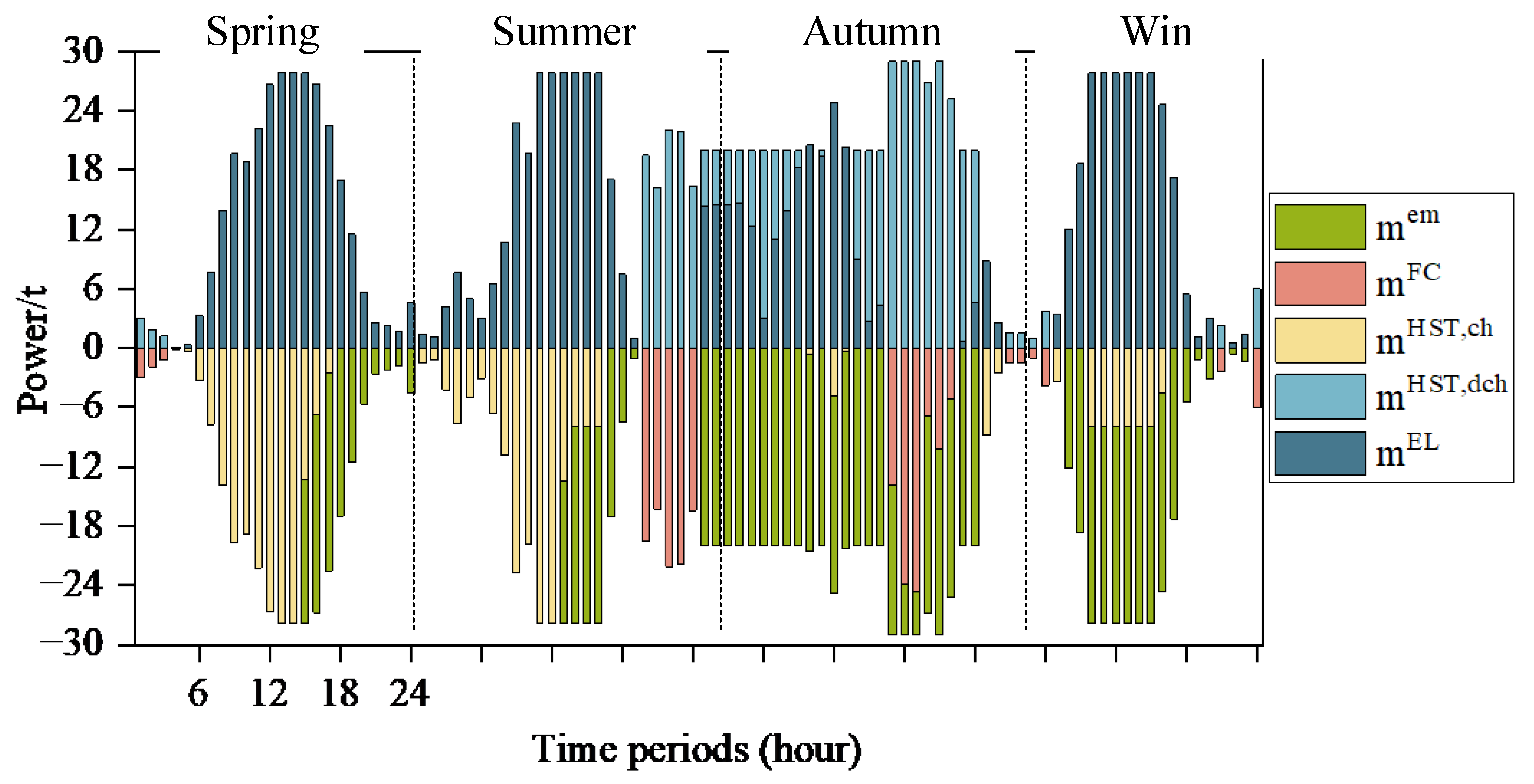 where Φ t represents the hydrogen storage quality in the HST at time t . η c h H S T and η d c h H S T denote hydrogen charging and discharging efficiency, respectively. m c h , t H S T and m d c h , t H S T are charging and discharging hydrogen power. μ c h , t H S T and μ d c h , t H S T indicate the hydrogen charging and discharging states at time t , respectively, which are 0–1 variables.
