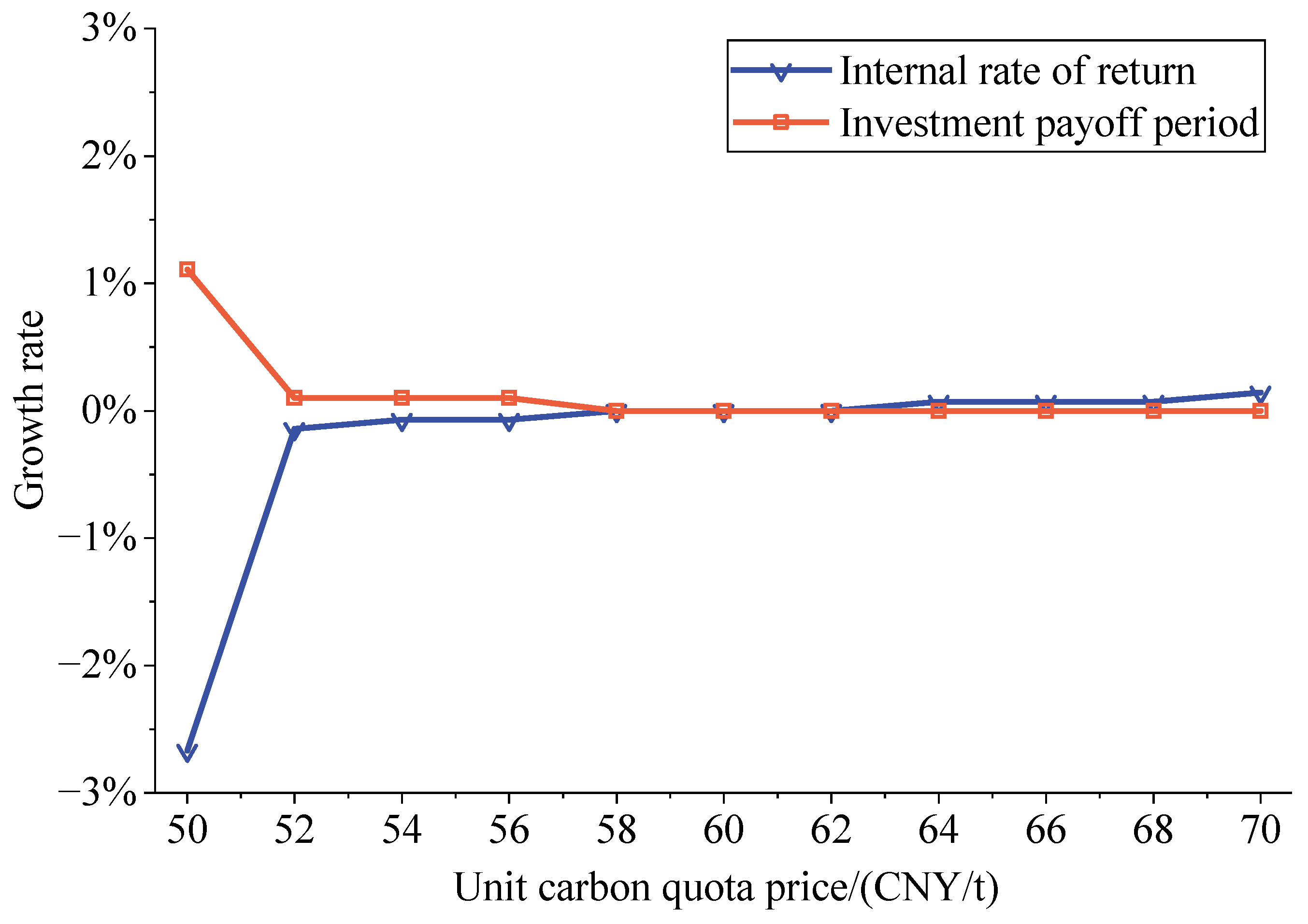 Figure 9. DG-REB investment payoff period and internal rate of return with different unit carbon quota price.
