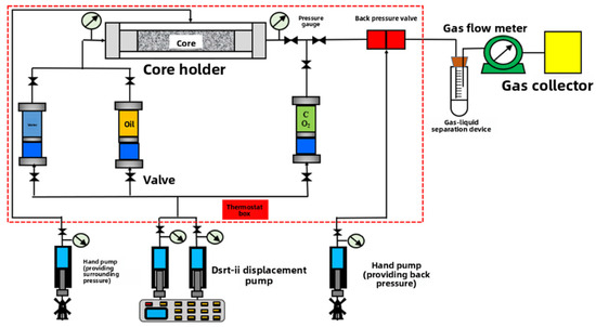 In 2014, Zhang Li [16] pointed out that, during CO2 miscible flooding, CO2 can extract light components, achieving miscibility between CO2 and crude oil. This effectively reduces capillary forces and lowers oil viscosity, thereby enhancing the recovery efficiency. In 2018, PVT experiments performed by Guo Maolei et al. [17] demonstrated that, at a constant pressure, the reservoir fluid density decreases with increasing CO2 injection concentrations, the volumetric expansion coefficient gradually increases with increased injected CO2 concentrations, and the reservoir fluid viscosity decreases with higher CO2 concentrations. In 2021, Gu Yinlong et al. [18] demonstrated through core flooding experiments that CO2 flooding significantly enhances the production capacity in ultra-low-permeability wells, improving the oil recovery factor with broad application prospects. In 2023, Wang et al. [19] discovered that the CO2 flooding efficiency in tight sandstone reservoirs positively correlates with reservoir permeability and CO2 injection pressure. Flooding efficiency rapidly increases from near-miscible to miscible flooding stages, while it decreases with further increasing injection pressures afterward miscible pressure is reached.