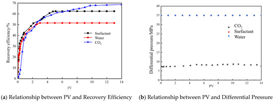 The comparison between recovery efficiency and the differential pressure of water flooding (Core N1), surfactant flooding (Core N2), and CO2 flooding (Core N3) at different injected pore volumes is shown in Figure 2. CO2 flooding demonstrated the highest oil recovery factor of 68.38%. Surfactant flooding is also good, with a recovery rate of 62.5%, while water flooding is 51.61%. CO2 flooding also has the advantage of a lower pressure differential needed, which is only about 7.5 MPa, compared to the 35 MPa for water and surfactant flooding. Therefore, CO2 flooding is more suitable for developing the target reservoir.