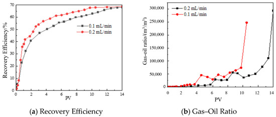The effects of the injection rate on the recovery efficiency and oil–gas production ratio are shown in Figure 3a and Figure 3b, respectively. At an injection rate of 0.2 mL/min (for core N3), the recovery efficiency exceeds that at 0.1 mL/min (for core N4) by only 0.62%. Furthermore, the gas–oil ratio in 0.1 mL/min is larger than it is in 0.2 mL/min, which is not favorable. The injection rate of 0.2 mL/min is used for the other experiments.
