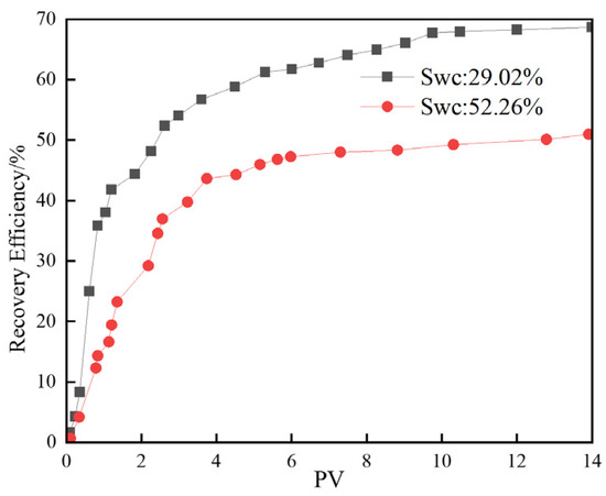 Due to high water-cut of the target oilfield, the impact of different water saturations on the recovery efficiency is studied and shown in Figure 4. For Core N5 with a 52.26% water saturation, the resistance for the CO2 flow is largely increased, resulting in a nearly 20% reduction in the recovery efficiency compared to a lower water saturation (Sw = 29.02%).