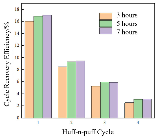 The recovery rates at different cycles decrease as the number of huff-n-puff cycles increases (as in Figure 5). When the soaking time is 5 h, the recovery rate achieved from the first two cycles accounts for 76.56% of the total recovery rate, which is 35.29%.
