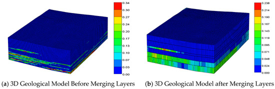 The 3D Field geological model was established by Petrel and then imported to CMG 2021 software to analyze the CO2 flooding effectiveness and optimize the production parameters. Two blocks named Well Block A and Well Block B were intentionally selected, which were representative wells for the whole oilfield. To make it clearer, Well A is a single existing production vertical well with a fracture half-length of 188 m and a conductivity of 10D·cm. Four injection wells are arbitrarily added in the simulation process to make a five-spot well pattern and check the development effect; this is called Well Block A. To enhance computational efficiency, layer merging was used, and, for example, the geological model for Well Block A was merged from 30 layers into 6 layers (Figure 6).