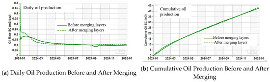 To check this layer merging accuracy and efficiency, daily and cumulative oil production data before and after layer merging were compared (Figure 7), with a very good consistency, showing that the layer merging is necessary and efficient.
