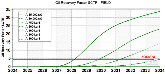 With the production pressure being at the minimum miscibility point, gas injection rates of 1000 m3/d, 3000 m3/d, 4000 m3/d, 5000 m3/d, 7500 m3/d, 10,000 m3/d, and 15,000 m3/d were separately set, with all other parameters held constant for simulation (Figure 8). Similarly to the experimental results, lower injection rates resulted in delayed oil production and reduced recovery rates; therefore, the injection rates should be maximized if possible. The recovery rates at different injection rates are shown in Table 6. Field data indicate that Well A has a fracture pressure of 44.2 MPa, meaning that the injection rate should not exceed 7500 m3/d. As the simulation results show, the recovery rate is below 27.39% after 10 years. Using the same methodology, Well Block B is also evaluated using the CO2 flooding development method. Well B has a fracture pressure of 31.7 MPa, showing that the injection rate should not exceed 3000 m3/d. The recovery efficiency of Well B is only 0.5% after 10 years, which is significantly lower than Well A.