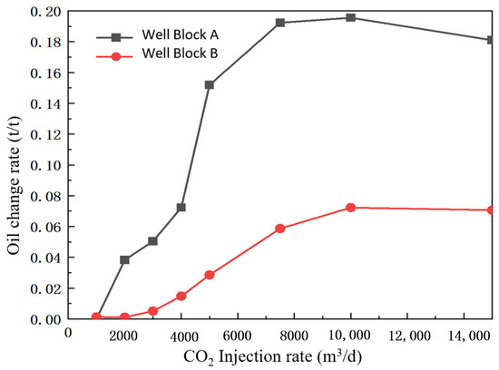 The oil change rate of CO2 refers to the mass of crude oil displaced per unit mass of injected CO2, indicating the displacement capacity of CO2 during oil recovery. The oil change rate for CO2 flooding at Well Block A and Well Block B was calculated as a function of the daily CO2 injection rates, with the results shown in Figure 9.