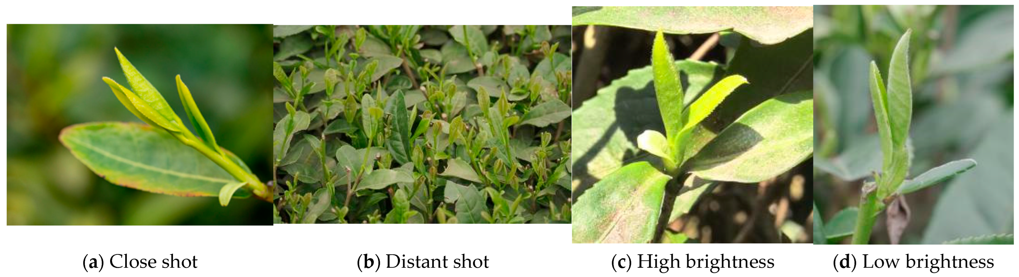 - Zhang, F. Research and System Development of Tea Bud Recognition and Location Based on Computer Vision; Hangzhou Dianzi University: Hangzhou, China, 2023. [Google Scholar]