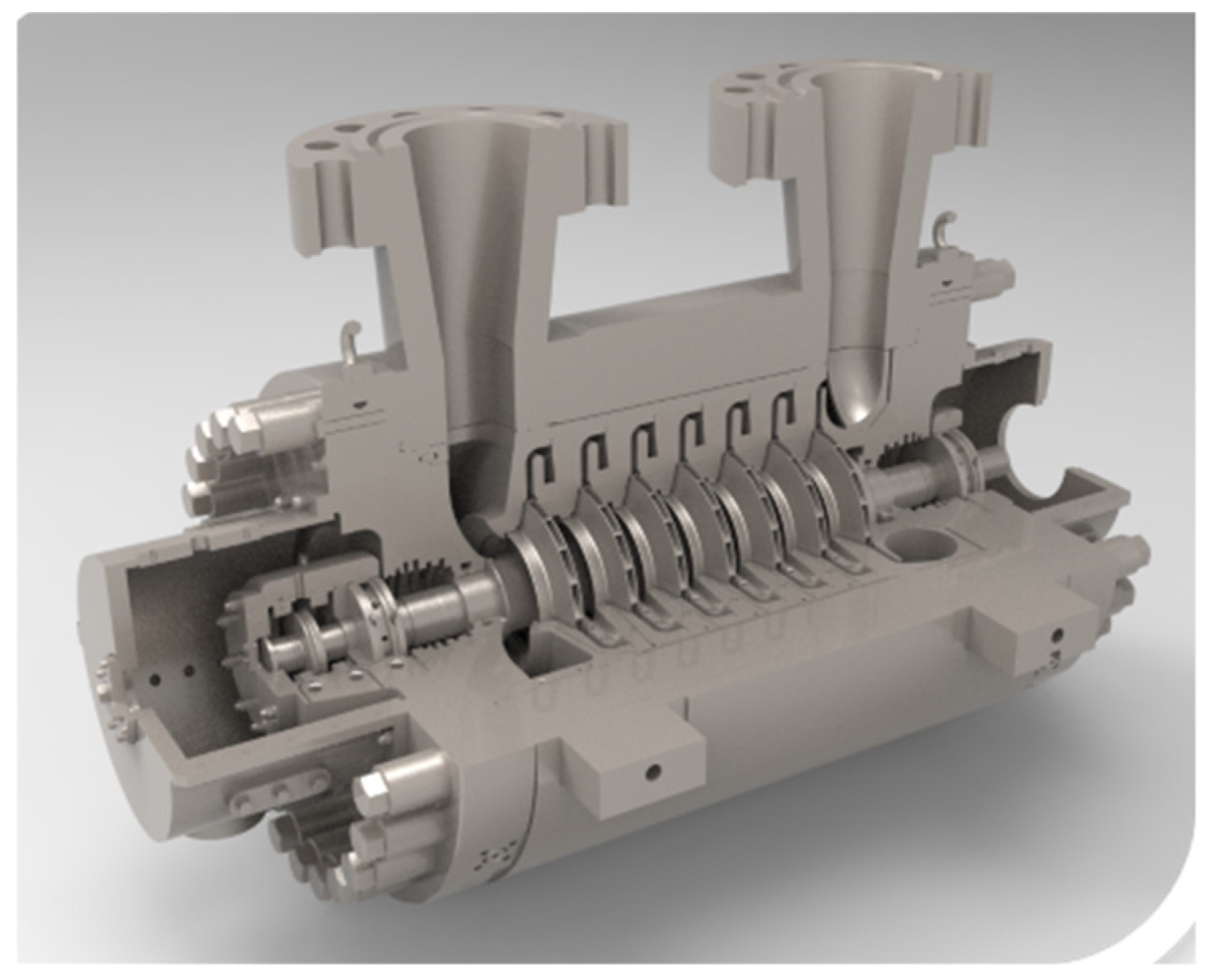 To meet the speed constraints, the impeller diameter was increased and the number of impeller stages was raised; the BCL808 centrifugal compressor was ultimately chosen. Structural measures include: large-diameter impellers with shortened bearing span to improve rotor stability, an enlarged balance disk to reduce axial thrust caused by the large pressure ratio, high-precision thrust bearings with good thermal performance to withstand residual axial loads, and imported dry gas seal housings to ensure sealing reliability under pressure fluctuations.