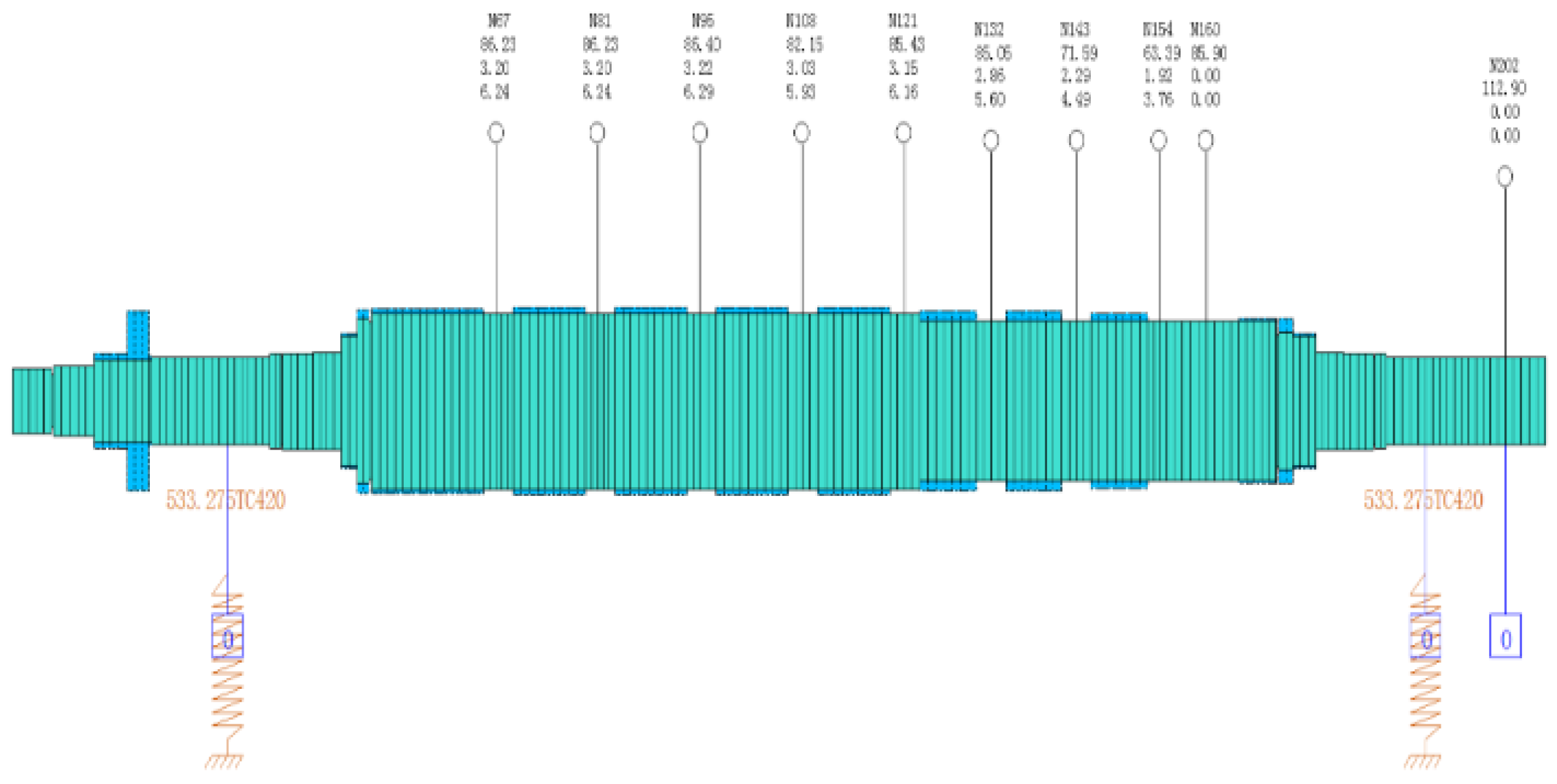 Rotor stability is particularly critical for large-shaft, high-pressure centrifugal compressors, which are prone to dynamic instabilities such as critical speed resonance, oil-film whirl, and vibration amplification. In offshore applications, the supporting configuration—such as the three-point anti-vibration mounting (AVM)—further affects the rotor’s dynamic behavior, making stability evaluation essential to ensure safe and reliable operation. The rotor-dynamic simulations in this study were therefore performed for a special design case characterized by a large shaft diameter, a heavy barrel casing, and high-pressure operation, rather than for conventional mature models.