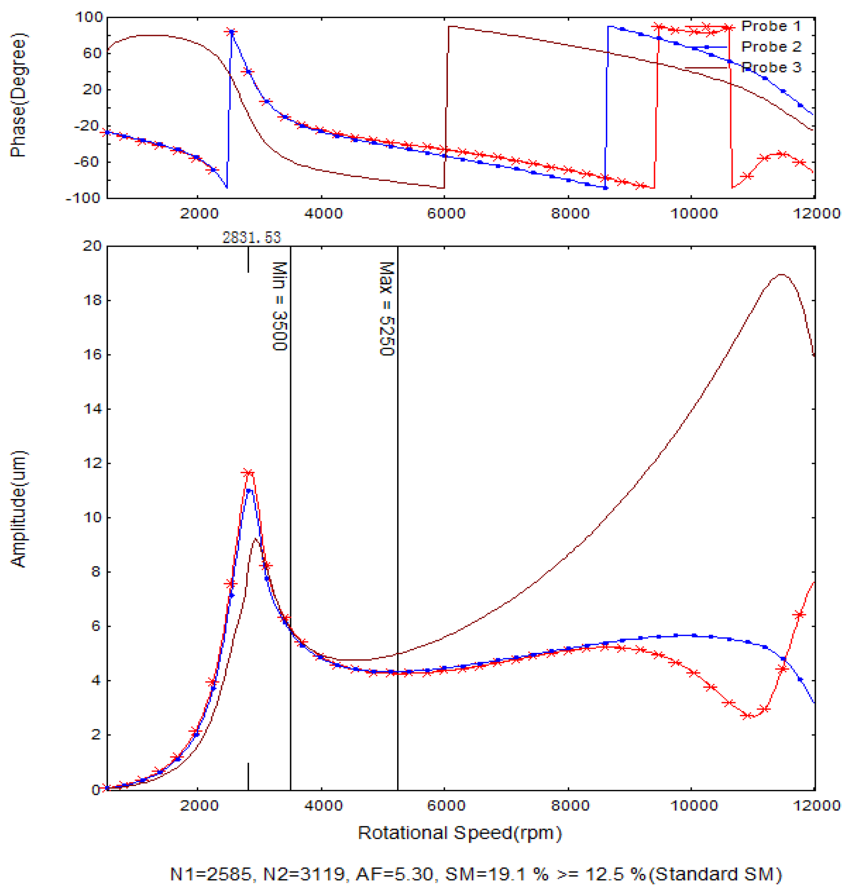 Rotor dynamics analysis was performed to verify critical speeds, unbalance response, and stability. The unbalance response and spectrum are shown in Figure 8 and Figure 9. The first critical speed margin is 19.1% and the second is 24.1%, both meeting API 617 requirements, indicating sufficient dynamic separation.