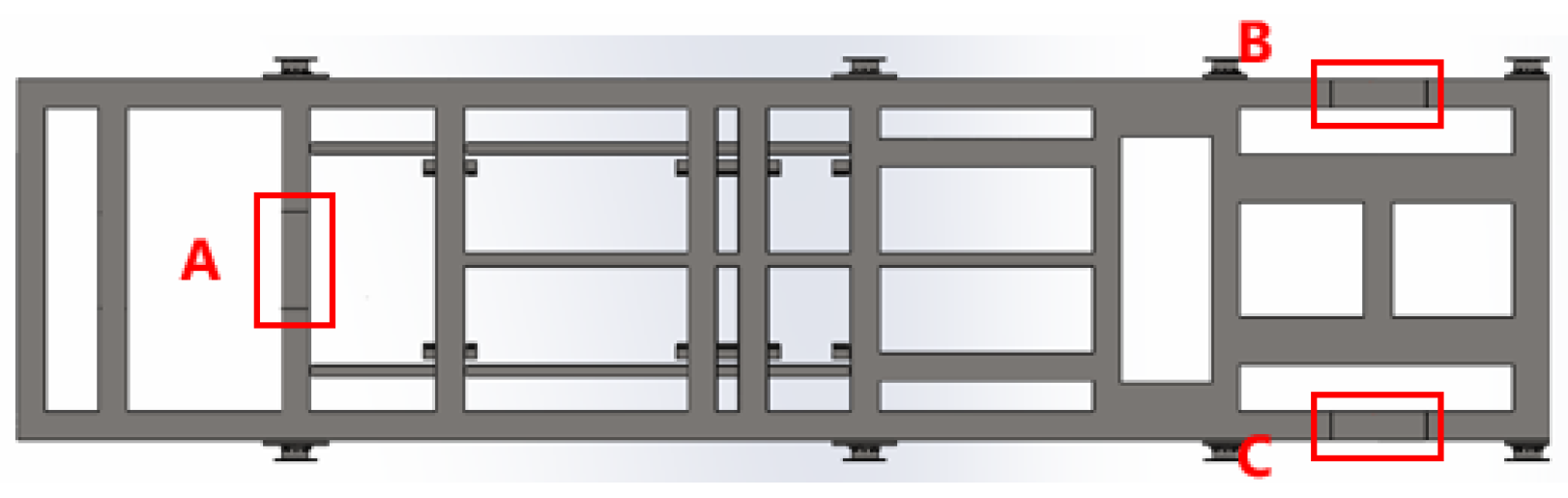 The support frame uses three support points to suppress vibration transmission to the platform structure. Elastic assemblies are installed under the base frame to form the isolation system. As shown in Figure 11, the three support points—A (under the gas turbine front support), B and C (under the compressor)—are arranged so that support A is fixed laterally and adjustable axially; support B is fixed in both directions; and support C is adjustable laterally and fixed axially. The calculated reaction forces in the X/Y/Z directions for the three supports are listed in Table 2 and can be used for platform structure verification.