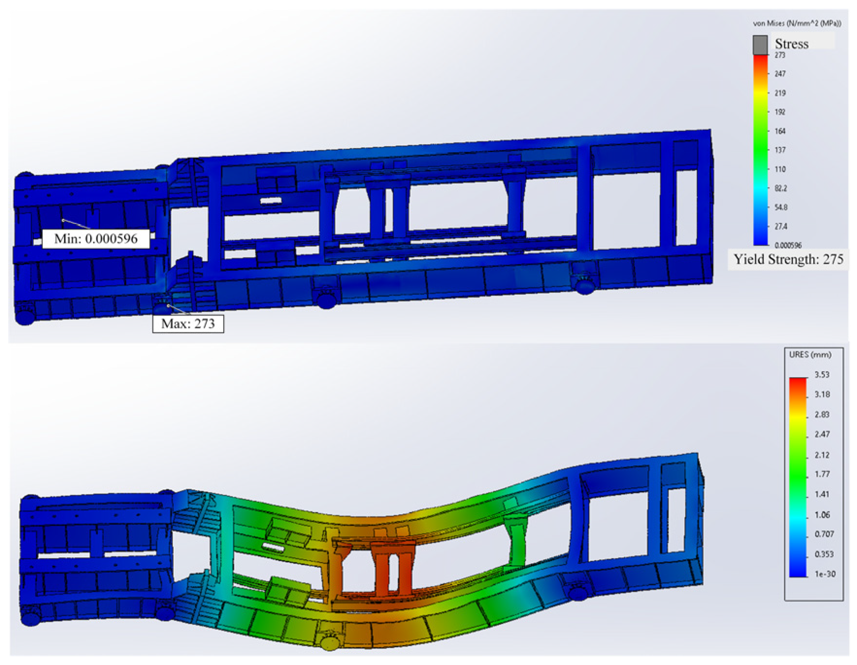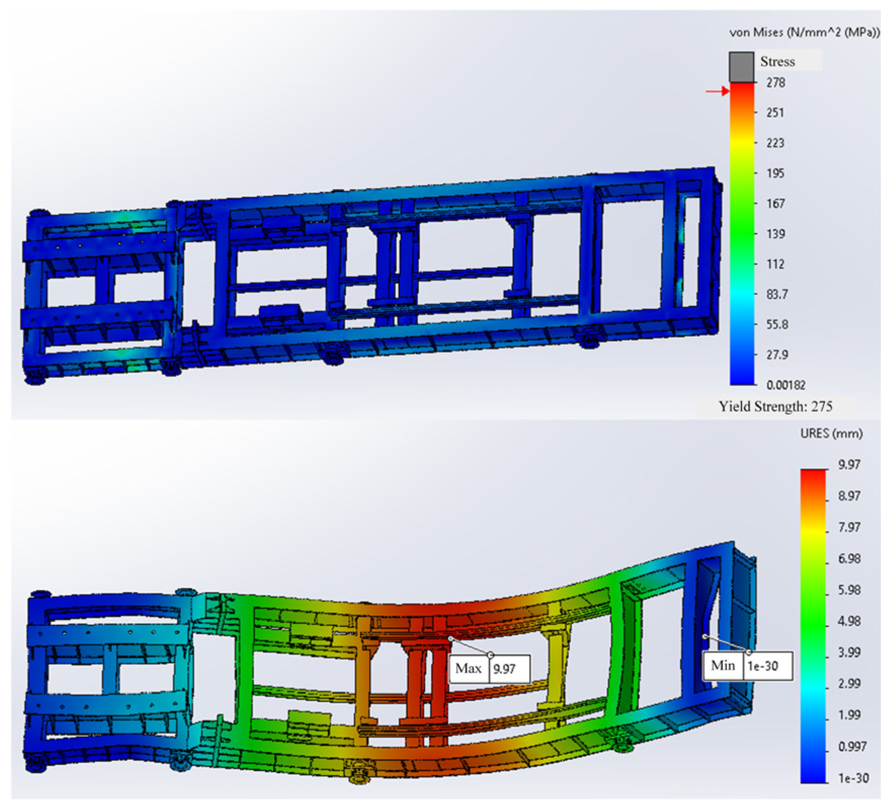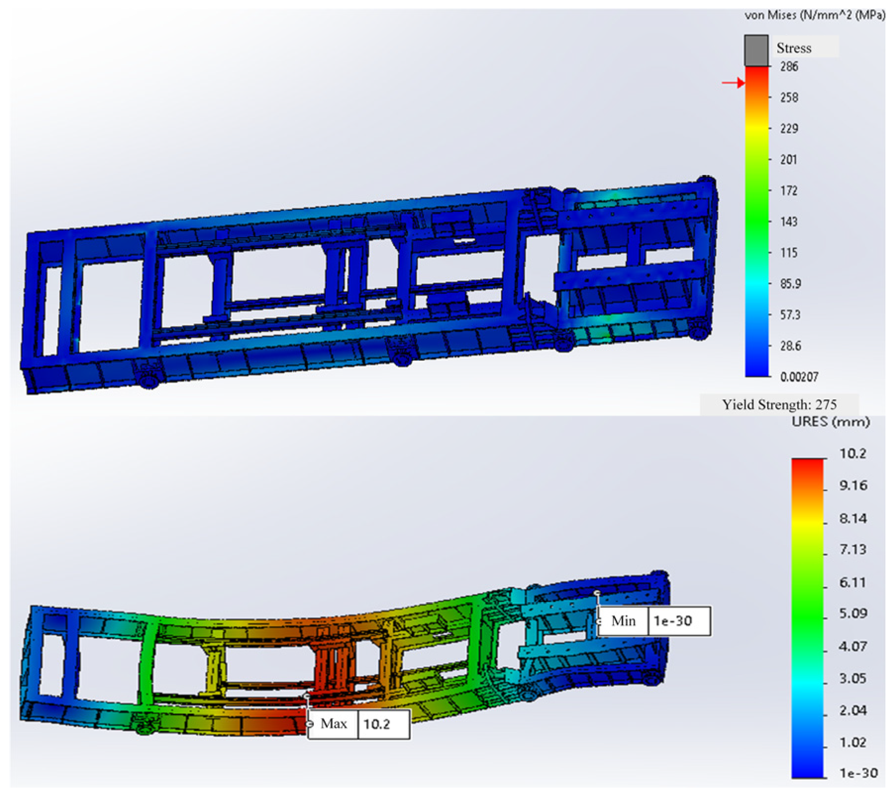 Finite element analysis was performed to verify stress and deflection under static, dynamic, and lifting conditions. The results are summarized in Table 3 and Table 4, while the stress and deflection distributions are shown in Figure 12, Figure 13 and Figure 14.