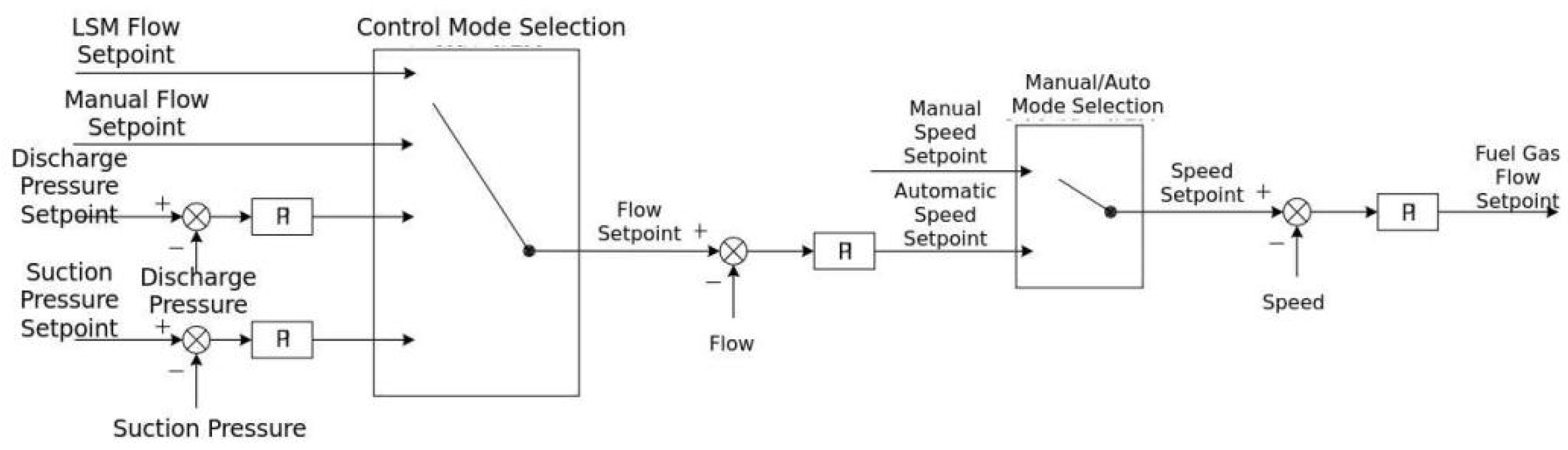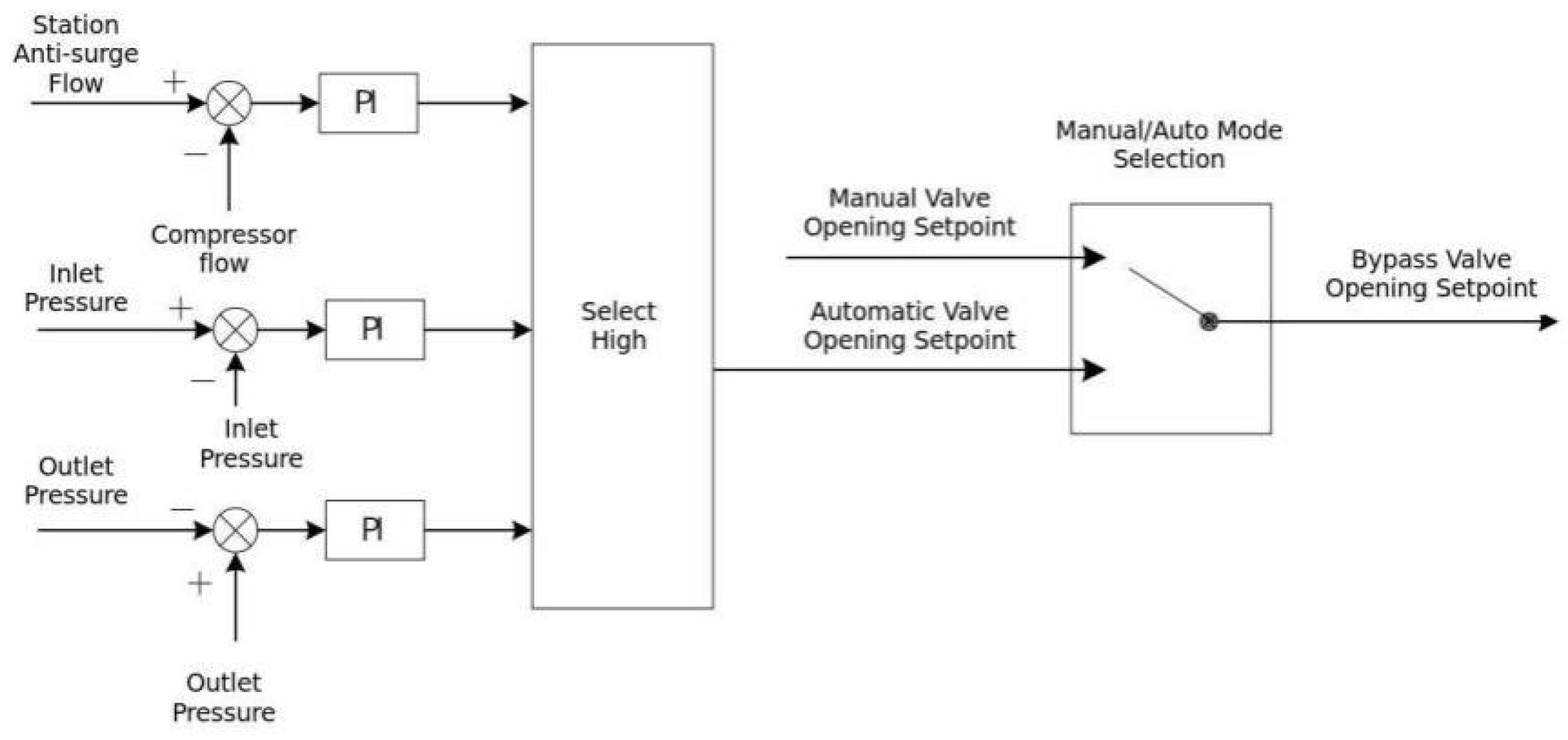 As illustrated in Figure 18, the LSM anti-surge control strategy maintains unit distances from the surge line by coordinating flow setpoints and bypass-valve operations. The LSM control structure (Figure 19) supports modes such as flow control, outlet-pressure control and inlet-pressure control. The bypass-valve control logic is shown in Figure 20.