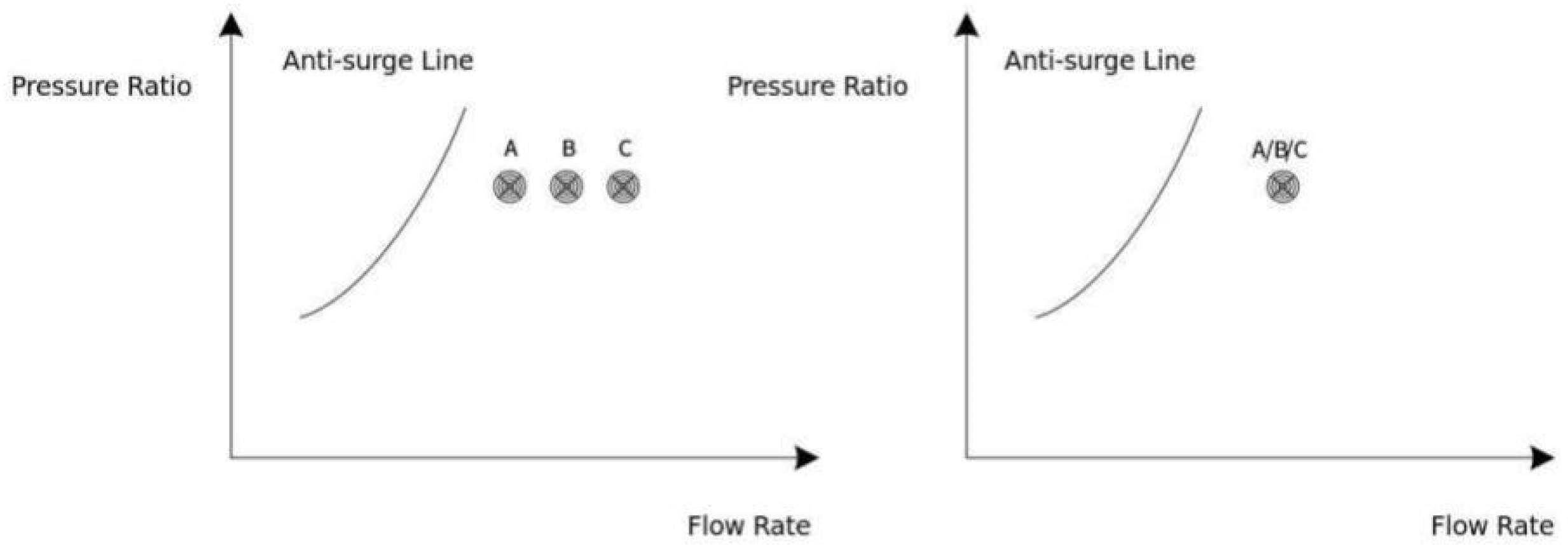 When three units operate in parallel, differences in compressor manufacturing tolerances, control precision, and piping result in different operating-point distances to the surge line even at the same rotor speed and anti-surge valve opening. The unit closer to the surge line is at higher risk. One LSM objective is to equalize the surge margins of all units to reduce this risk.