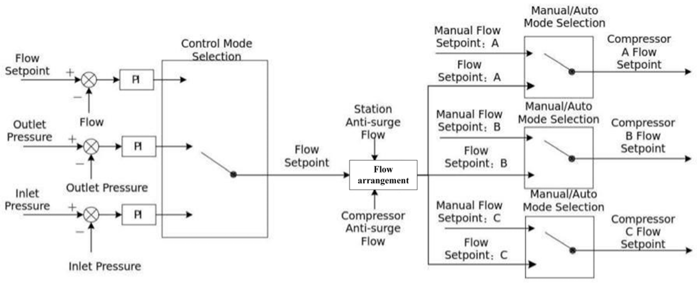 As shown in Figure 17, the load distribution is used to coordinate and maintain a consistent distance of each unit’s operating point from the surge line/anti-surge line. The booster station bypass valve control includes high outlet pressure protection, low inlet pressure protection for the booster station, and unit anti-surge protection. Process control includes inlet pressure control, outlet pressure control, and flow control.