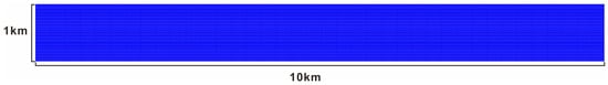 The boundary conditions of the model mainly include grid resolution, flow conditions, and transport conditions. For channel bars in the braided rivers of the Sulige Gas Field, their lengths and widths mostly range from 100 to 850 m []. Accordingly, as shown in Figure 1, the model domain is set to 10 km in length and 1 km in width, with individual grids measuring 12.5 m along the long axis and 5 m along the short axis. This setup not only accurately captures subtle changes in channel bar boundaries but also avoids blurring of channel bar morphology caused by excessive grid coarseness [,]. Water inlets and outlets are, respectively, placed on both sides of the grid’s short axis: the water inlets are defined by discharge magnitude, while the water outlets are defined by water level changes. Meanwhile, the long-axis boundaries of the grid are set as non-erosive barriers to simulate the real scenario of braided rivers flowing within river valleys []. While accounting for the horizontal plane, the vertical direction of the model is divided into 3 layers based on the core geological characteristics of the sandy braided rivers in the Lower Member 8 of the He8 Formation in the Sulige Gas Field, namely “shallow water, low energy, and gentle slope.” Each layer has a uniform thickness, which fully covers the key vertical structures of the near-bottom layer, middle layer, and surface layer. Additionally, the model adopts a vertical σ-coordinate that automatically adapts to water depth changes through adjustments, enabling relative refinement of the near-bottom region. Combined with the setting of the near-bottom reference concentration in the Delft3D sediment module, this further eliminates the impact of layer thickness on sediment deposition calculations.
