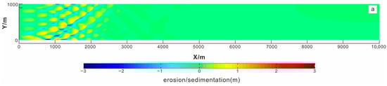 Except for the three variables of topographic gradient, discharge, and sediment grain size, all other parameters in the experiments are set consistently to ensure a single variable in the experiments. Table 1 lists the other parameters as follows: The hydrodynamic module uses Manning’s equation to calculate riverbed roughness. In sediment simulation, the dry bulk densities of sand and mud are set to 1650 kg/m3 and 500 kg/m3 respectively. The main physical constant, gravitational acceleration, is set to a constant value of 9.81 m/s2. Water density is set to the freshwater density of 1000 kg/m3. To accelerate the geomorphic evolution process and meet the requirements of the simulated event scale, the geomorphic evolution coefficient is set to 100. This coefficient speeds up the simulation while ensuring the simulation results do not become distorted. The total simulation duration is 30 days, and the computational time step is 0.5 min. If the time step is reduced to 0.25 min, the fineness of the simulation results increases by approximately 5%, while the computational load rises by roughly 53%. When the time step is increased to 1 min, however, the channel bar morphology in the simulation results becomes unstable and the fineness deteriorates.