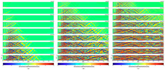 Evolution diagram of single-factor analysis of discharge: (a) discharge: 1300 m3/s; (b) discharge: 1500 m3/s; (c) discharge: 1880 m3/s.