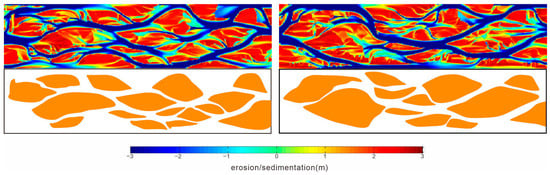 However, all simulations in this study have certain limitations: only several main factors were considered, including discharge, gradient, and sediment grain size. In modern rivers, however, the morphology of braided rivers and the scale of channel bars are jointly influenced by multiple factors. For instance, the role of vegetation in river development was not taken into account: vegetation can effectively resist water erosion, thereby hindering sandbody deposition. These multiple factors interact with each other and jointly regulate the sedimentary evolution of rivers. In addition, all river boundaries in the model are set as straight lines, while the boundaries of modern rivers are usually curved; river sinuosity may also affect sandbody deposition to a certain extent.