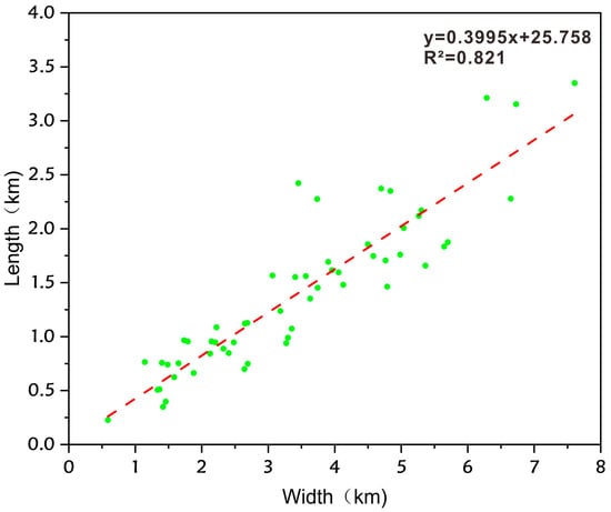 Typical modern sandy braided rivers were selected. Figure 9 shows the length-width relationship of channel bars, which was fitted as y = 0.3995x + 25.758 (R2 = 0.821) after extracting its length/width parameters from satellite images. This high goodness of fit indicates that the length and width of channel bars in modern braided rivers have a strong linear correlation, and the fitting curve can effectively reflect the morphological laws of real channel bars. Figure 10 presents the length-width relationship fitted based on the simulation results of this study, which is expressed as y = 0.2714x + 63.779 (R2 = 0.6221). However, due to simplified boundary conditions such as straight channels and absence of vegetation, the R2 is slightly lower than that of modern deposits. Nevertheless, the fitting trend is highly consistent with that of modern deposits: both show a linear law where length increases synchronously with increasing width. The error between the length/width value range of simulated channel bars and the proportional range of modern braided rivers is small. Although the simplification of boundary conditions reduces the goodness of fit, it does not undermine the significance of the linear trend. This further indicates that the simulation results reliably reflect the morphological evolution laws of channel bars in real braided rivers, providing a solid quantitative basis for subsequent sandbody characterization.
