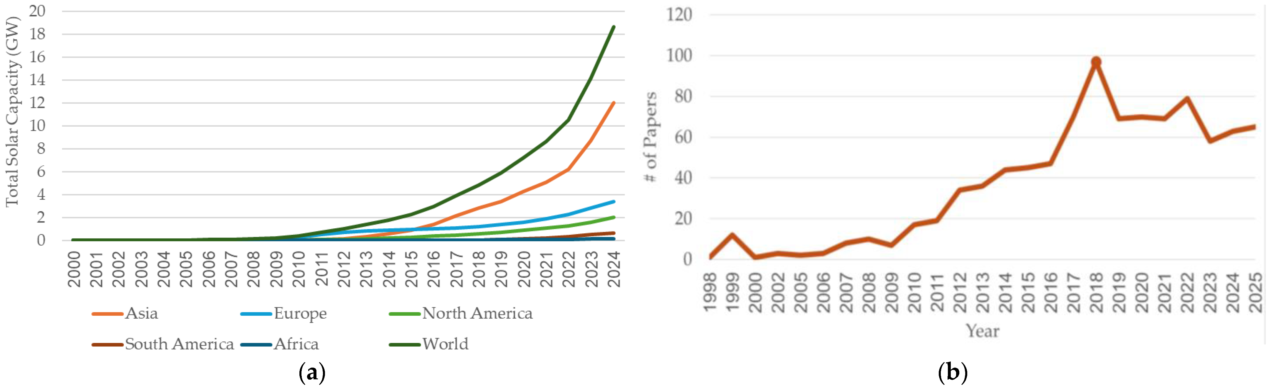 In recent years, solar photovoltaic (PV) energy sources have become increasingly significant. One of the most promising renewable energy sources for supplying the future’s growing electrical energy needs is this one. PV resources’ common benefits include their widespread availability, dependability, lack of maintenance, longevity, lack of acoustic noise, and lack of environmental contamination [1]. Based on earlier benefits, PV systems are now widely used globally. Figure 1a presents the installed solar energy capacity worldwide [2].