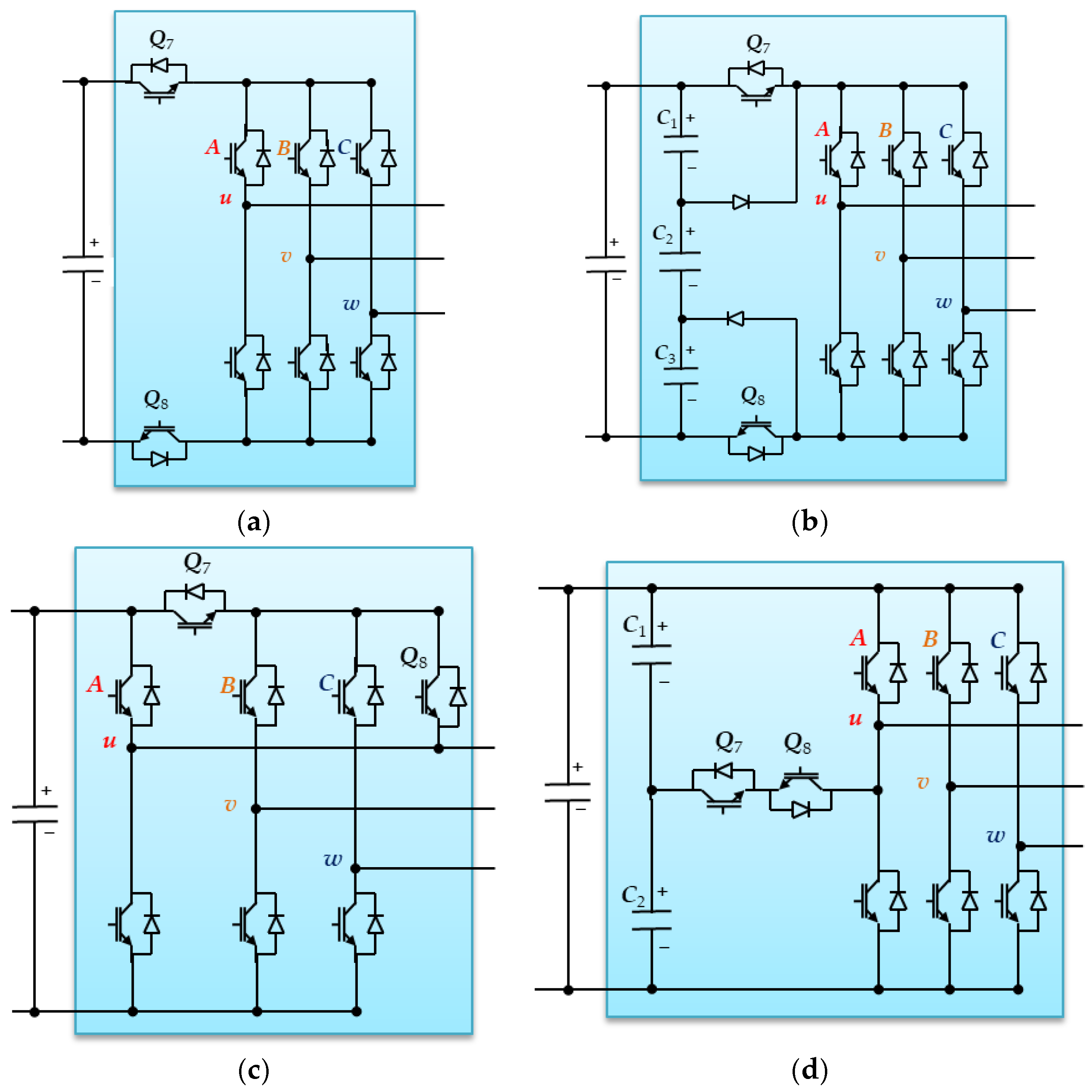 H8, a more modern topology, is shown in Figure 7a [35,85,86,87]. It is made up of two power transistors that link the conventional 3-arm transformerless inverter to the DC bus. One may consider it to be the three-phase counterpart of the well-known 1-φ H6 transformerless inverter scheme. To lower the common mode voltage (CMV) for electrical drives, the first suggested H8 inverter architecture was developed [35,85]. The concept was then applied to grid-connected transformerless PV systems. The suggested design in [21] combined the advantages of DC bypass structures with AC bypass circuits. The findings revealed a tiny THD of the grid current and a low leakage current. Nevertheless, the controller employed had a low response, and the modulation was the conventional method. In [44], the H8 topology’s performance was contrasted with that of the traditional H6-type voltage source inverter. However, the system’s dynamic reaction was subpar, and its efficiency was low. The H8 was altered in [33] to achieve 0% CMV mutations. The method relied on the control strategy and a changed configuration to enter and exit the zero-voltage vector. Because of the 50% decrease in CMV amplitude, the H8 architecture performed better than H7 according to the results of [86]. As a result, the H8 architecture enhanced the attenuation of leakage current.