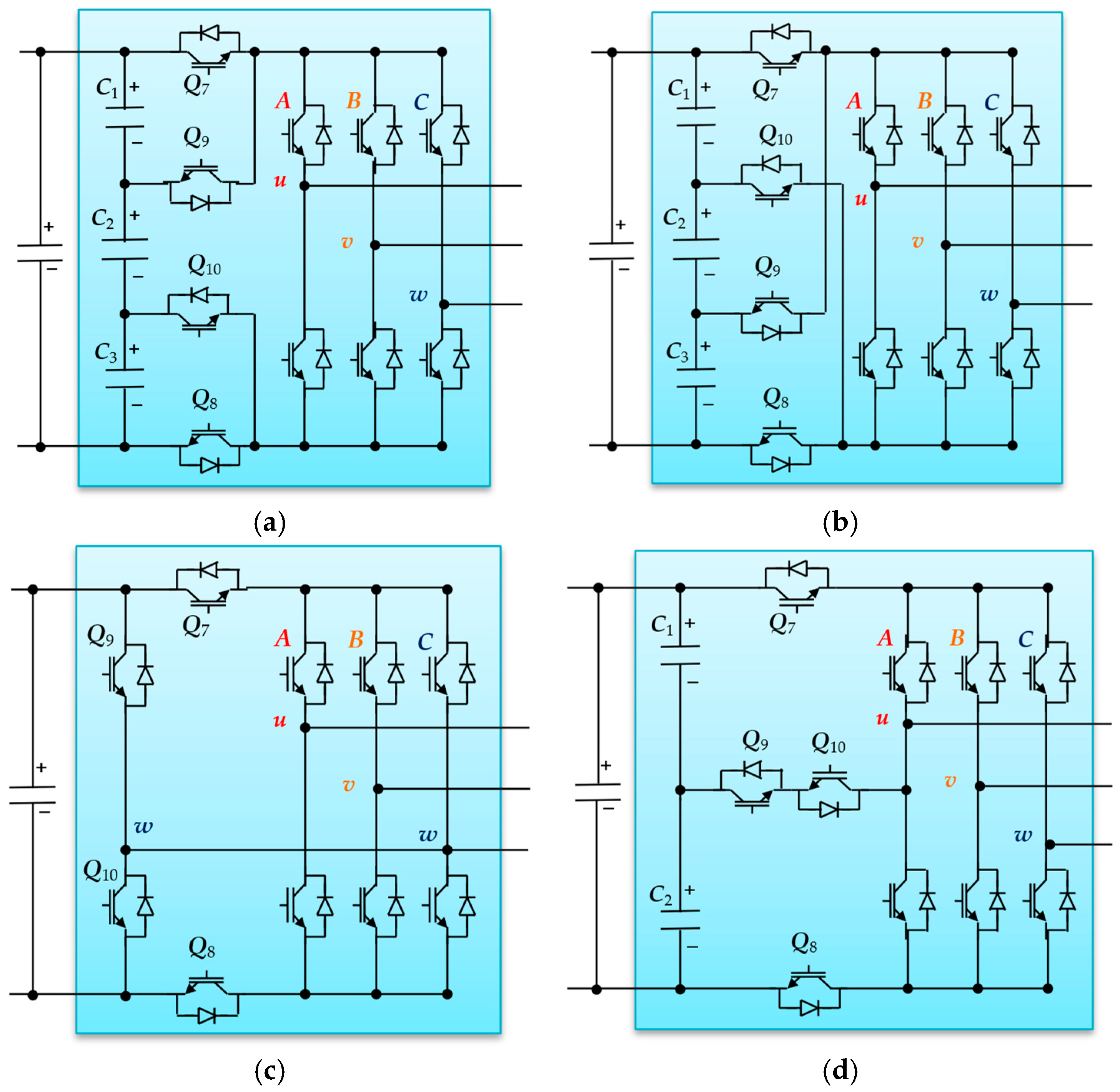 Additionally, during the freewheeling period (0 to Vd), this design exhibits significant changes across the DC link. In order to simplify power transmission, the inverter operates normally in the balanced condition, with Q7 ON and Q8 and Q9 OFF. While Q8 and Q9 offer a bidirectional freewheeling channel to reduce leakage current and regulate CMV, Q7 is turned off under imbalanced situations.