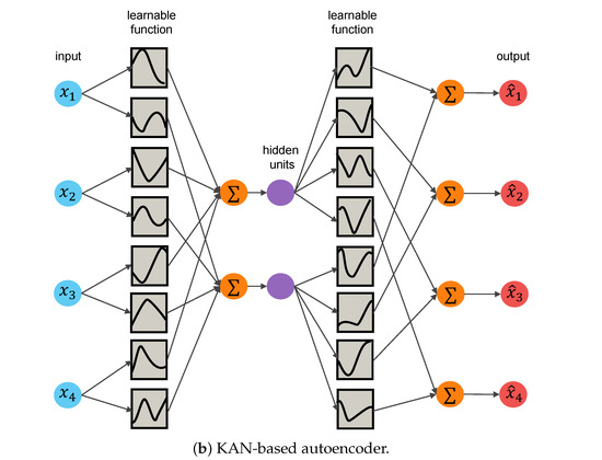 Kolmogorov–Arnold autoencoders (KAN-AEs) extend conventional autoencoders by replacing the dense layers in the encoder-decoder pair with KAN layers, as illustrated in Figure 1. Each connection in a KAN-AE learns its own transformation, allowing complex nonlinearities to be captured without deeper or wider architectures. KAN-AEs can be fully KAN-based [34] or hybrid, combining KAN and MLP layers [35]. In this study, all KAN-AEs employ only KAN layers, ensuring that performance differences can be attributed to the KAN architecture.