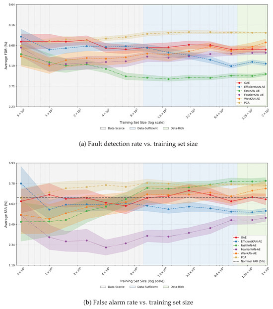 For controllable faults, an ideal monitoring system should maintain a low and stable fault detection rate, as excessive alarms can lead to unnecessary interventions. Figure 3a summarizes FDR trends, indicating that the average rate for nonlinear models remained within a narrow 4–5.5% range across all training regimes. This consistency shows that increasing the amount of fault-free data had little influence on sensitivity to minor, self-correcting disturbances. Among nonlinear models, OAE displayed nearly constant performance, whereas EfficientKAN-AE showed a slight decline in FDR with larger datasets. FastKAN-AE achieved the strongest improvement, reaching an average FDR of 4.6% as increased. In contrast, WavKAN-AE and FourierKAN-AE exhibited small FDR increases, implying mild over-sensitivity to nominal process variability.