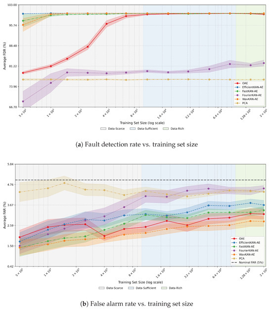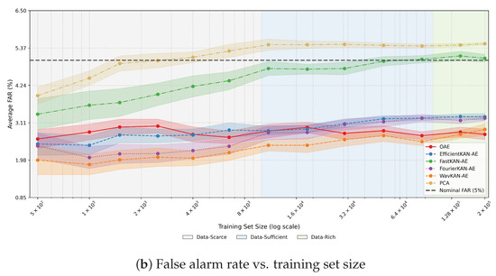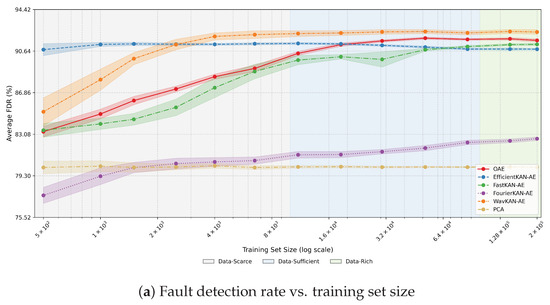 The false alarm rates (see Figure 3b) complement these observations. EfficientKAN-AE and FourierKAN-AE consistently achieved the lowest FAR values (4–4.5%), while OAE and WavKAN-AE maintained slightly higher yet acceptable rates around 5%. Notably, FastKAN-AE exhibited a moderate rise in FAR at larger training sizes, suggesting a conservative detection bias. The PCA baseline performed worst on both metrics, yielding the highest FDR (≈7.6%) and FAR (≈5.7%) at higher data volumes. This underscores the advantage of nonlinear models in distinguishing normal fluctuations from genuine fault conditions.