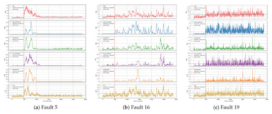 Within the step fault category, all models achieved detection rates above 98%, demonstrating consistent detection of large, steady-state deviations. Fault 5, however, proved considerably more challenging (see Figure 6a). Although the control system restored the measured process variables to their nominal values, the cooling water valve position remained outside the normal operating region. Models that do not capture the coupling between manipulated and controlled variables failed to recognize this deviation, as seen in PCA, OAE, and FourierKAN-AE. In contrast, EfficientKAN-AE, FastKAN-AE, and WavKAN-AE achieved near-perfect detection (98–100%), indicating that their nonlinear parameterization captured subtle correlations between valve position and the system’s thermal balance.