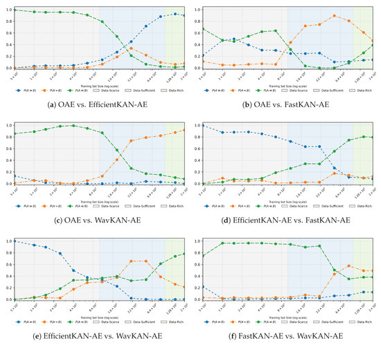 In the data-scarce regime, EfficientKAN-AE consistently outperformed the other KAN-AEs by a substantial margin. The posterior probability mass favoring EfficientKAN-AE exceeded 0.85 in all pairwise comparisons, reaching against FastKAN-AE (Figure 7d) and against WavKAN-AE (Figure 7e). Within the same regime, WavKAN-AE maintained a moderate yet consistent advantage over FastKAN-AE, with posterior mass above 0.74 (Figure 7f), although this margin was considerably smaller than that of EfficientKAN-AE.