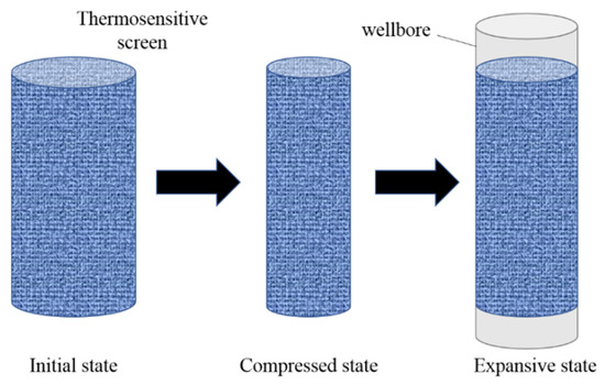 Therefore, we introduce a kind of expansion string, namely the thermosensitive screen (hereafter abbreviated as TSS) [5,6,7]. Its advantage is that the screen can maintain a smaller size (i.e., compressed state) than the conventional oil screen in the lowering process. After the screen is run to the target layer, the formation temperature stimulates the expansion of the screen. As the original size of the thermosensitive screen is greater than the wellbore size, it can provide extrusion force for the wellbore wall when expanded and pressed against the wellbore wall. Compared with traditional mechanical expansion screen technology [8,9], this technology can greatly shorten the construction period and features a simple expansion process. It can be used for the completion of oil and gas wells with limited wellbore conditions such as long horizontal section wells, complex structure wells, and offshore wells [10,11].