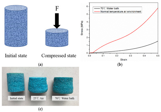 Compression experiment under constant temperature. (a) Compression progress; (b) compression stress and strain curve. (c) Experimental samples.