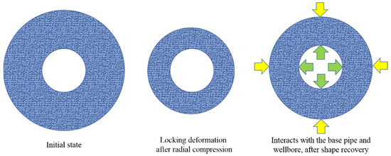 The wellbore stability of deep and ultra-deep wells is a complex problem often encountered in drilling and completion engineering [1,2,3,4]. During the drilling stage, borehole collapse will cause accidents such as sticking and obstruction, affecting the drilling rate and cementing quality. In the completion stage, wellbore collapse often occurs due to the decrease in wellbore pressure or excessive drawdown pressure. Wellbore collapse will plug the borehole and affect subsequent production or operations. In oil fields, perforated tubing or slotted screens are often run to the collapsed layer to support the wellbore. However, due to the limitation of fixed size, the running ability of common screens in the wellbore is limited, especially in horizontal wells or extended reach wells. It is difficult to run them in a well section with serious dogleg. As the screen string of designed size cannot be run to the target layer, the operators usually have to replace it with a screen string of a smaller size to run it into the well, which will weaken the support effect and lead to the re-accumulation of cuttings in the wellbore, thereby affecting oil production.