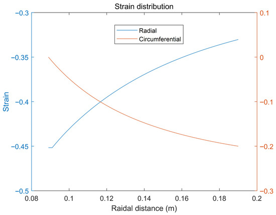 Figure 7 shows the radial strain and circumferential strain along different radial positions. The radial compressive strain at the outermost part is the largest and the circumferential compressive strain is the smallest.