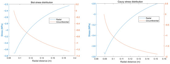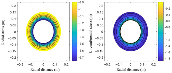 Figure 8 shows the change in nominal and Cauchy radial stress and circumferential stress with radial distance, in which the radial compressive stress decreases with the increase in radial distance, and the circumferential compressive stress increases with the increase in radial distance. Figure 9 shows the distribution of radial and circumferential stress clearly. The radial stress near the base tube is the largest, while that near the outermost layer is the smallest. Therefore, after the shape of the memory material is restored, the extrusion force on the base pipe is greater than that on the wellbore.
