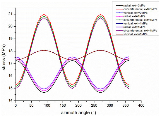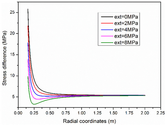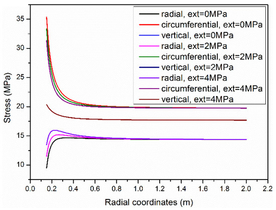 The elastic stress distribution near the open hole after considering the influence of the thermosensitive screen is shown in Figure 12 (In the figure, “ext” refers to the extrusion stress of TSS. “Radial” refers to the stress in the radial direction. The abbreviation also applies to Figure 13 and Figure 14). Under these formation parameters, the radial stress is the smallest and the circumferential stress is the largest. The formation stress gradually tends to be stable from near the wellbore zone to far from wellbore zone. After considering the influence of the thermosensitive screen, the stress distribution of the formation near the wellbore is significantly improved. The radial stress increases with the increase in the contact stress of the thermosensitive screen, and the circumferential stress decreases with the increase in the contact stress of the thermosensitive screen. Therefore, the stress difference borne by the formation near the wellbore is reduced due to the expansion of the thermosensitive screen.