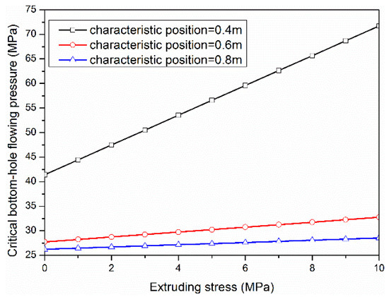 Figure 15 shows the critical bottom flowing pressure under the influence of the thermosensitive screen. Obviously, in the near-wellbore zone (0.4 m around the well), the critical bottom flowing pressure increases with the increase in the extrusion stress of the thermosensitive screen. The critical bottom flowing pressure when there is no extrusion stress is 41.4 MPa, while the critical pressure increases to 71.7 MPa when the extrusion stress of the thermal screen is 10 MPa. According to the definition of critical drawdown pressure, the critical drawdown pressure can be increased by 95% under the current formation conditions. Therefore, the study of a high-expansion-rate and high-stiffness thermosensitive screen will play a significant role in strengthening the stability of wellbores.